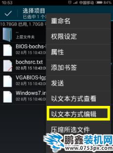 5,从弹出的扩展面板中,点击“以文本方式编辑”项,此时将以文本方式打开“bochesr.txt”文件并进入编辑状态。