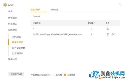 1、在电脑中下载完成火绒安全软件,然后进入主界面→防护中心→ 系统防御:自定义防护 →添加规则包→添加规则,如下网站建设制作图所示。