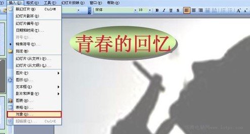 首先打开ppt软件,点击工具栏中的插入,选择对象。