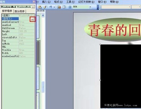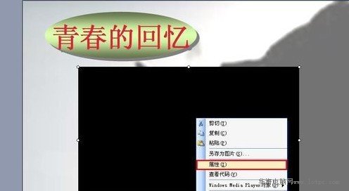 此时会在幻灯片的页面上会显示播放器的黑屏画面,在画面上单击右键,选择属性(I)