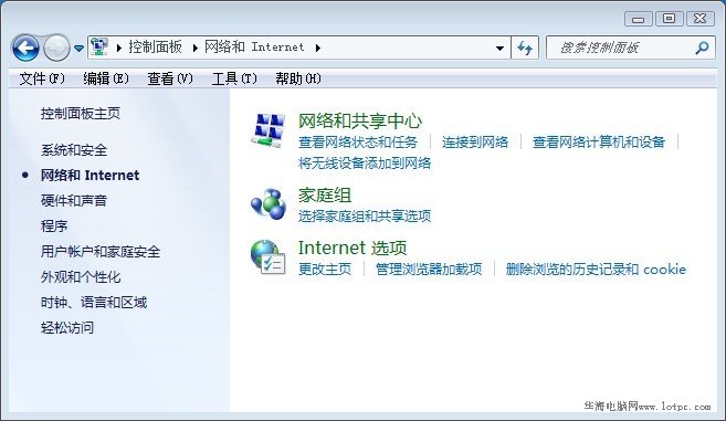 开始进入“控制面板”选择→“网络和 Internet”点击→“网络和共享中心”。