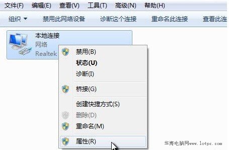 请选择本地连接 或是 无线网连接,然后右键菜单选择 属性(R)
