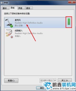 接着打开之后,就显示了系统的麦克风,其中右边的绿色的部分是显示音量的位置,如果对着麦克风喊一下,右边的绿色的长条就会变高,就可以根据绿色方块的高矮来判定音量的大小。
