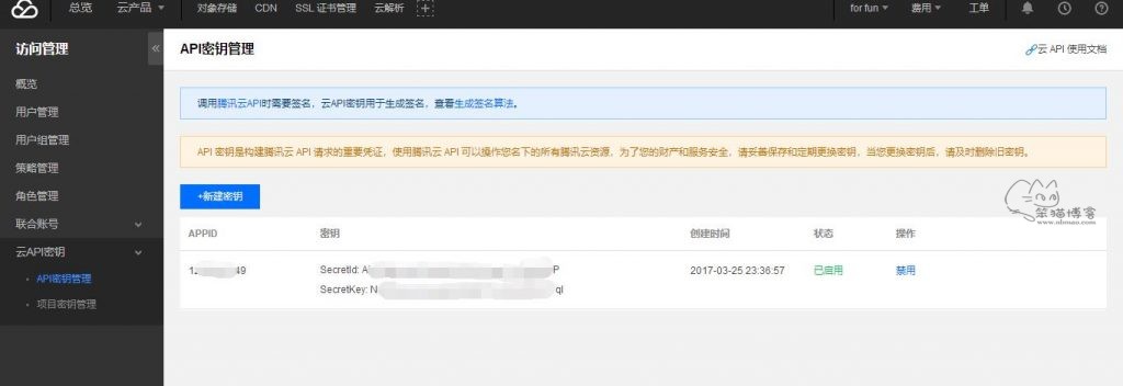 这两项都在在腾讯云“云API密钥”里面,地址:https://console.cloud.tencent.com/cam/capi