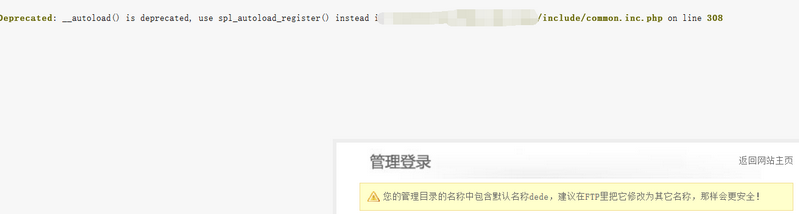 打开首页正常,登录后台的时候直接提示“Deprecated:dede5.7模板 __autoload() is deprecated, use spl_autodede手机模板load_register() instead in**********”,如下图: