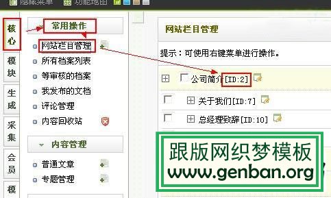说明:其中的id=’2’是指定栏目的id ,查看栏目id的方法,如下图,在栏目名称后就是栏目id ,输入代码后,保存,刷新网站,这时首页对应板块就调用出栏目内容了。