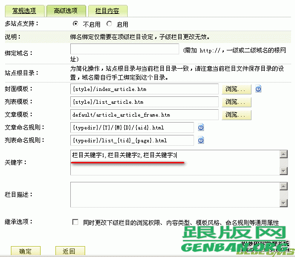 修改栏目,在栏目高级选项关键字处填入你的优化文字,在模板list_article.htm中修改title添加{dede:field name='keywords'/},如图: