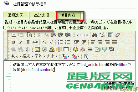 修改栏目,在栏目内容中填入你的优化文字,在模板list_article.htm中修改title添加{dede:field.content/},如图: