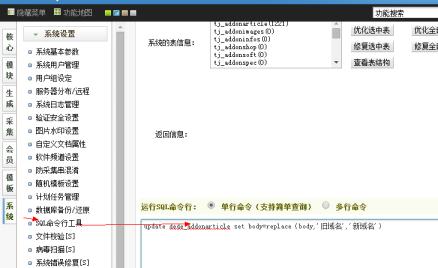 复制下面SQL语句进织梦DedeCms的后台,点 系统 -> SQL命令行工具,然后看到一个文本框,在文本框内输入SQL语句,按确定之行。如果操作成功,上面会提示"成功执行x个SQL语句!"